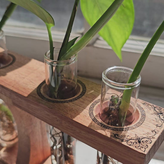 The Hourglass propagation station takes inspiration from shaker style furniture. The sleek yet modern look allows your house plants and propagation clippings to blend seamlessly with the wooden holder. The Hourglass serves both as a functional item for plants and as a showcase statement piece that elevates your living space.