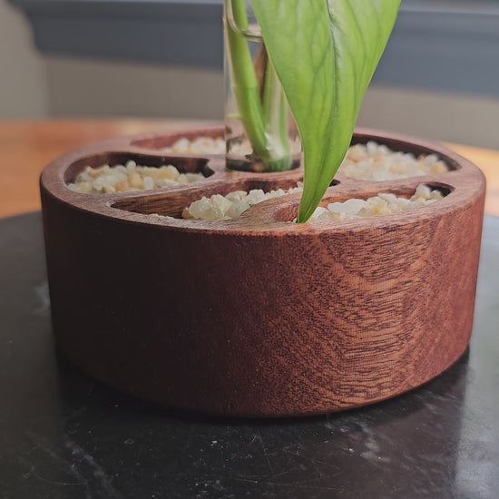 Bring a touch of calm and nature into your home with our zen garden circular propagation station, the perfect gift for plant lovers and boho decor enthusiasts. This elegant wooden holder is crafted from specially selected mahogany and cherry hardwood, chosen for their stunning, unique grain patterns that make each piece one of a kind. Designed to beautifully display your pothos cuttings and houseplants, it adds a serene, earthy vibe to any space, whether its a cozy nook, windowsill, or as a thoughtful housewarming gift. Nurture your plants while nurturing your soul!